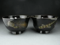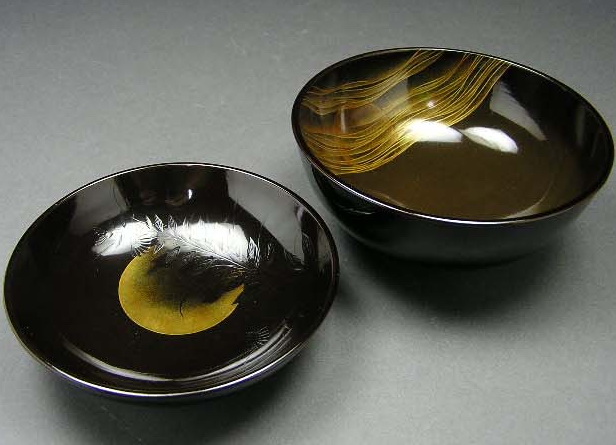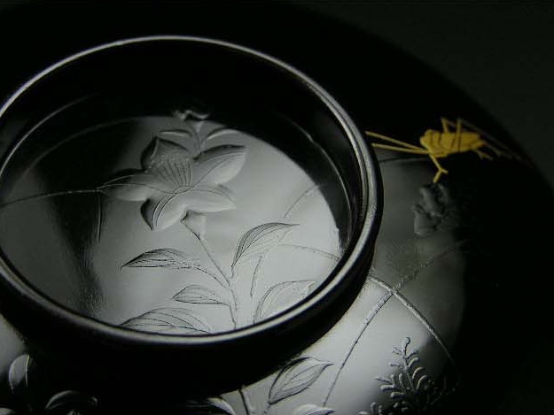 黒地にあえて黒で草花を描いて秋の夜の闇を、そして鳴き交わす虫たちの目に見えぬ存在感を金色で表現しています。蓋を開ければ秋草の向こうに月がでています。そして椀の底には水に映った月。しかも5客それぞれで微妙に月が動いています。風流でおしゃれな品です。