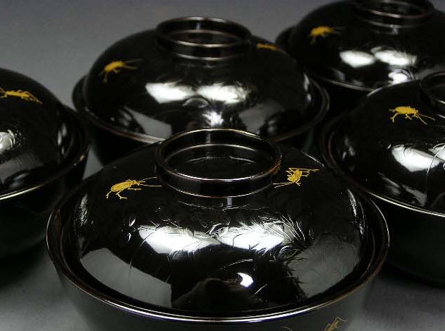 秋草蒔絵夜虫図吸物椀5客(江戸後期)