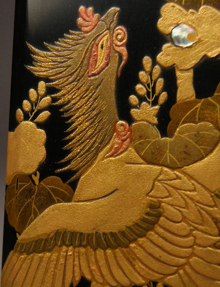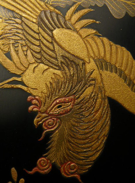 力強くかつ繊細な鳳凰の蒔絵が表に、蓋の裏には優雅に舞う蝶が描かれています。