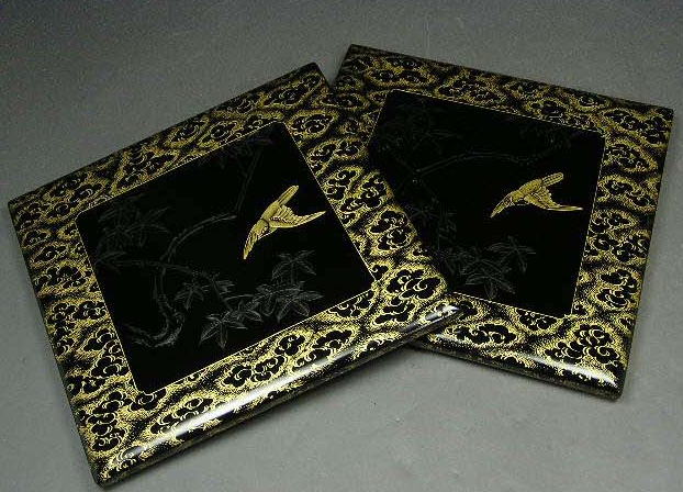 細密な沈金細工が施されたお重です。鳥は金で、花は銀で表現されています。残念なことにひび割れが数カ所発生してしまったため、特別処分価格でご提供します。必ずひび割れ箇所の現物をご確認のうえ、お求めください。(箱はついていません。)