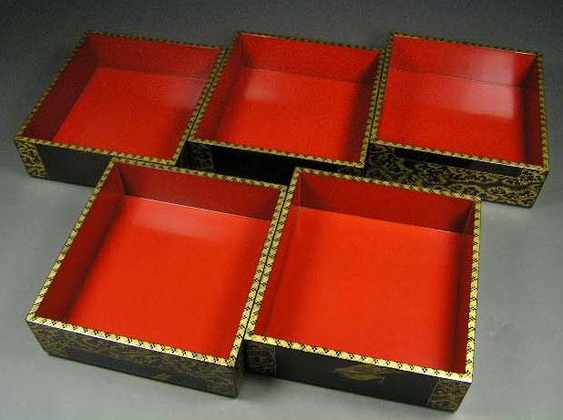 輪島総沈金花鳥図五段重(江戸後期)