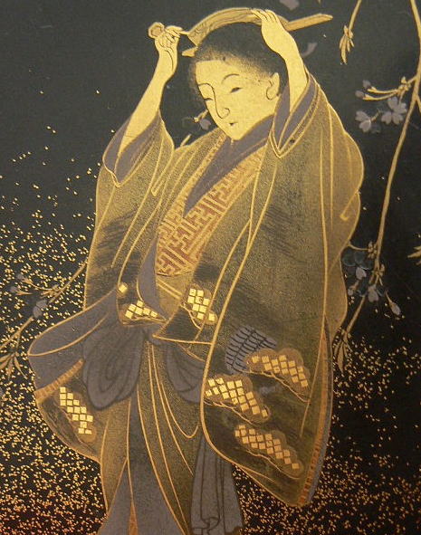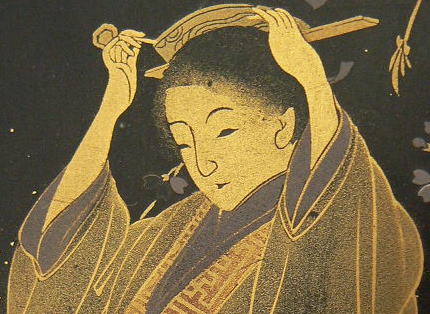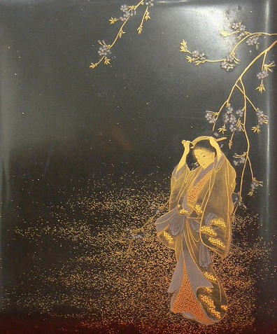 柳の木の下でかんざしを直す、艶やかな女人が蒔絵で表現されています。とてもやさしい顔です。