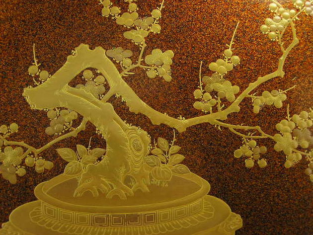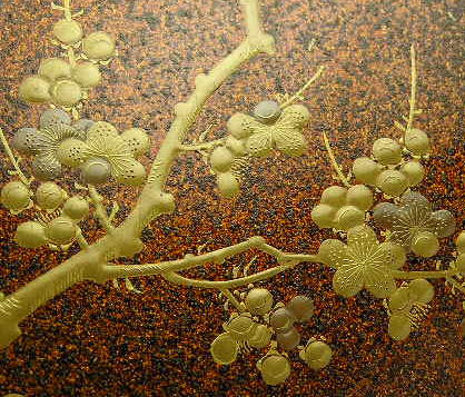 盆栽の梅を盛り上げ蒔絵で表現した、美しい一品です。表裏とも総梨地です。現代では作れない、往時の職人の高い技術力が結晶した美しい盆です。